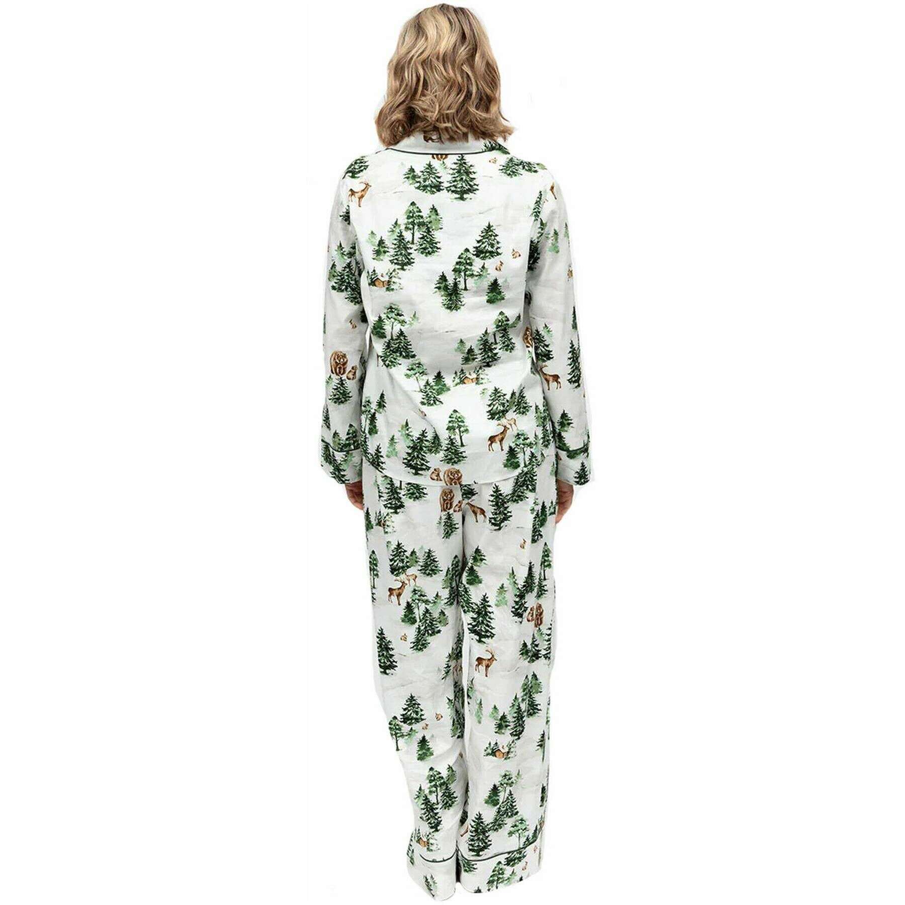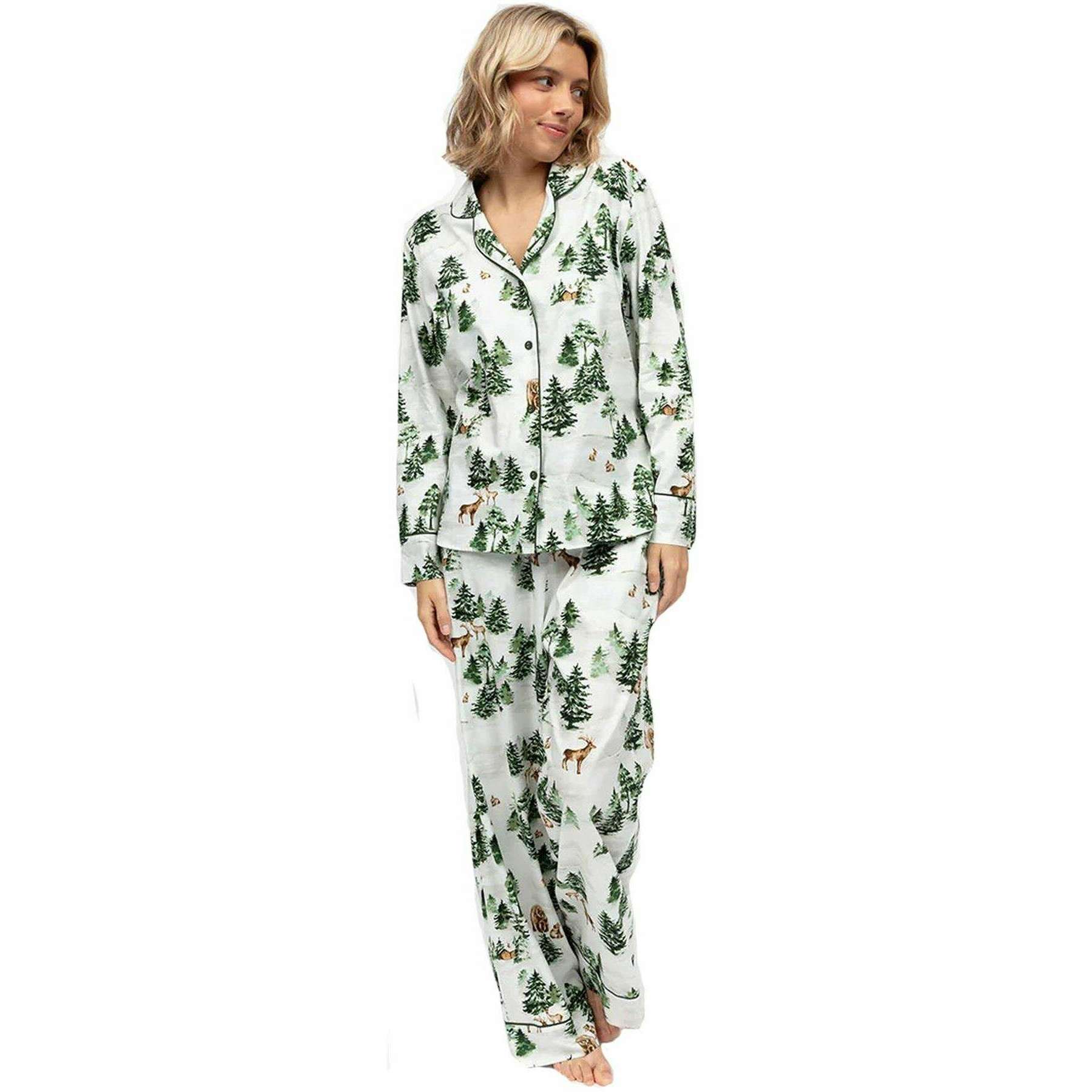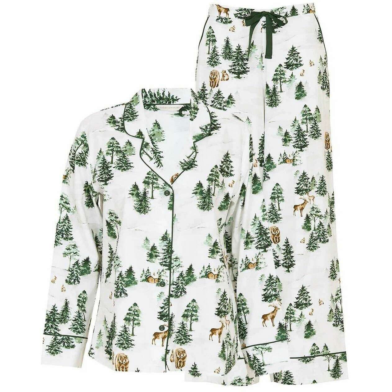 Dette pyjamassæt i jersey med bregne alpint til kvinder af mærket Cyberjammies er lavet af 60% bomuld og 40% modal og fremvises i grønt. Også den olivengrøn/hvide pyjamas er designet i et blomstermønster. Det anbefales at maskinvaskes med vrangen ud, ikke lægges i blød, vaskes med lignende farver for at holde disse pyjamaser i god stand. Alle pyjamaserne kommer komplet med cyberjammies-mærker. Cyberjammies Fern Alpine Print Jersey Pyjamas Set - Olive Green/White bringer hyggelige vinterstemninger til din nedetid. Dette sæt er lavet af en blød bomulds-modal blanding og har et fredfyldt alpine print af fyrretræer, hytter og skovdyr på en sprød hvid baggrund. Toppen inkluderer en ærbødig krave, olivengrønt piping og dækkede knapper for en skræddersyet finish, mens de brede ben har en elastisk bagside, flad front, justerbar snøre og sidelommer for komfort og lethed. Perfekt til festlige morgener eller afslappede aftener, dette sæt kombinerer sæsonbestemt charme med hverdagsluksus.
