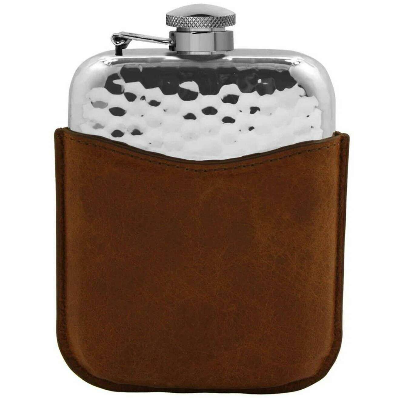 Engelsk Pewter Company 6oz fanget top hamret pungekolbe og pose - sølv/brun