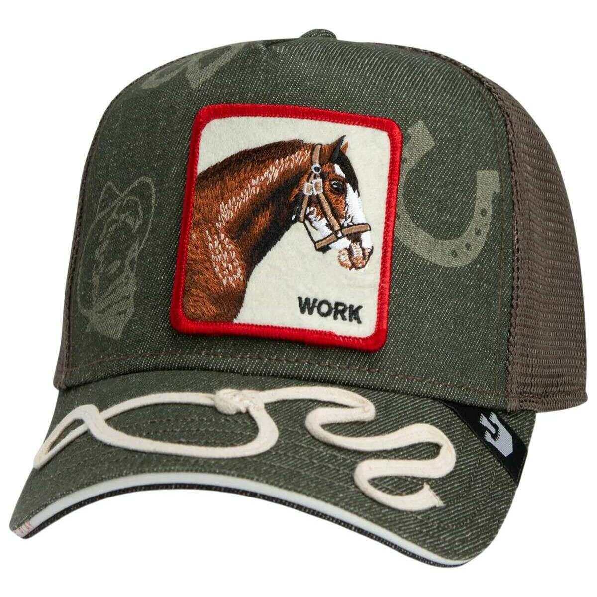 Denne dobbeltskift trucker hat til mænd eller kvinder er designet af mærket Goorin Bros i en grøn farve og er lavet af 57% polyester og 43% bomuld. Alle hattene kommer komplet med goorin bros tags. Goorin Bros Double Shift Trucker Hat - Olive Green er lavet til dem, der ikke kan prale af deres styrke, de lever det. Med sin dybe olivengrønne tone, robuste denim-stil materiale med et subtilt hesteskoprint og den dristige Workhorse patch, kombinerer denne kasket rå robusthed og umiskendelig cowboyånd. Lassobroderiet på kanten tilføjer et ekstra strejf af håndværk og forstærker kaskettens stærke karakter og opmærksomhed på detaljer. I mellemtiden sikrer den åndbare mesh-ryg og den justerbare snapback-lukning varig komfort og en perfekt pasform, uanset hvor hårdt dagens arbejde eller leg måtte være. Denne kasket er designet til gørere, ikke klagende, og leverer attitude uden at råbe. Et statement for alle, der lægger i arbejdet og ser forbandet godt ud.