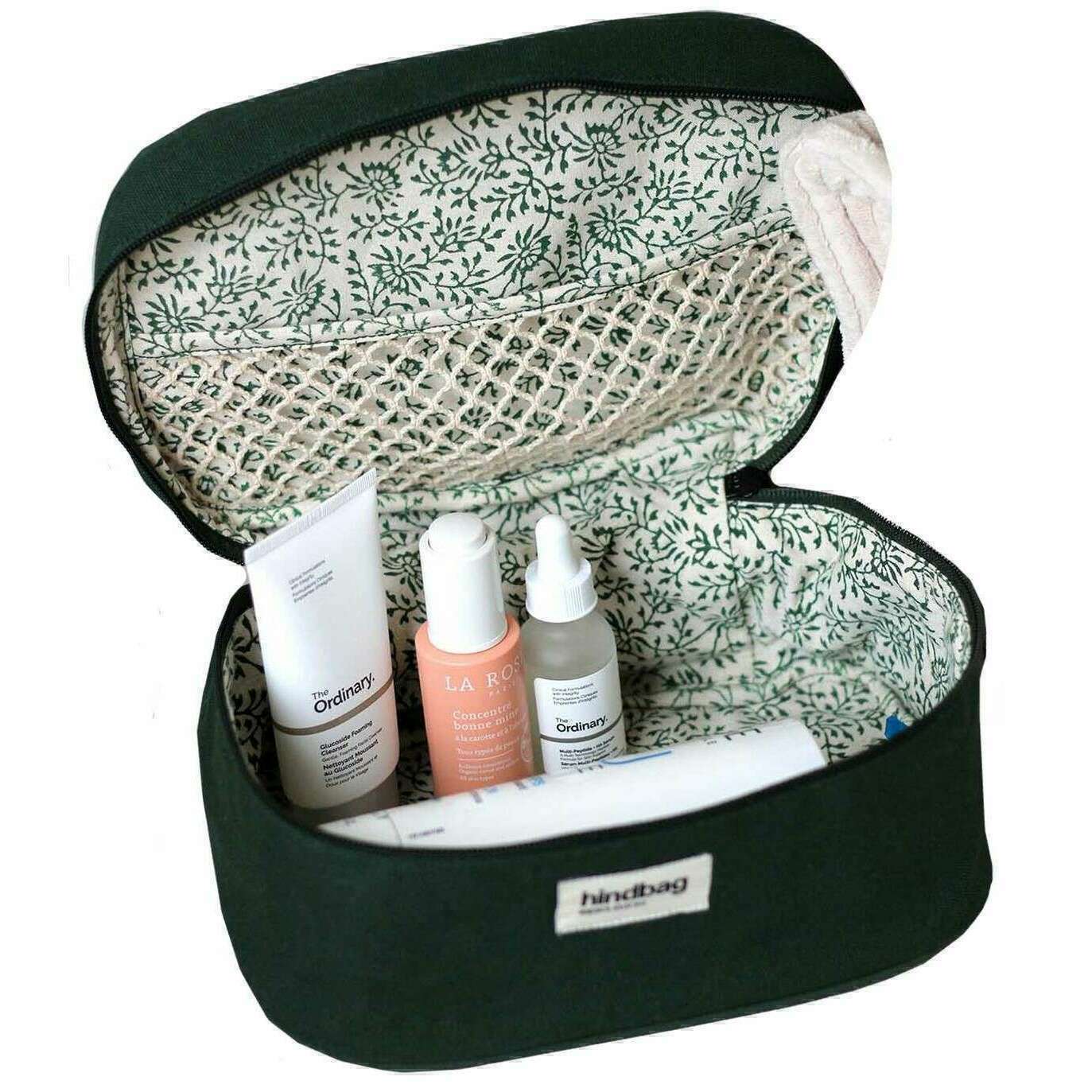 Designer Hindbag har bragt dig denne unisex 100% organisk bomuldspose ved hjælp af skovgrønne toner. Det måler 13,5 cm (højde) x 16 cm (bredde) x 25 cm (dybde). Alle poser leveres komplet med bagefter emballage. Hindbag Gaspard Vanity Bag - Forest Green tilbyder både rejsende og hverdagsbrugere en praktisk og stilfuld måde at holde deres toiletartikler organiseret og tilgængelig. Det indvendige net er perfekt til pænt at arrangere toiletartikler, kosmetik og andre personlige genstande. Fås i en række farver, dette moderigtige tilbehør repræsenterer en harmonisk fusion af funktionalitet og æstetik, der serverer dem, der værdsætter både stil og praktisk på deres rejse.