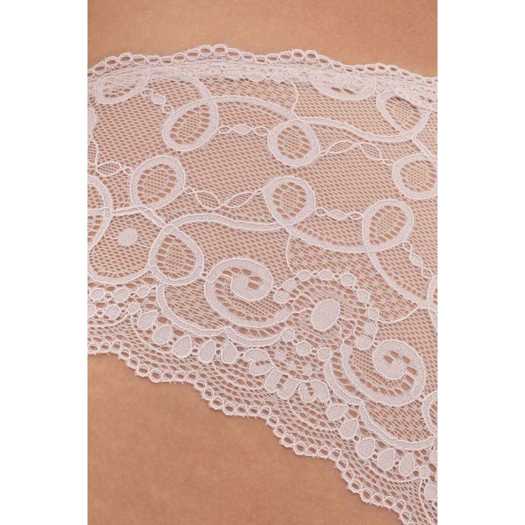 • OEKO-TEX Standard 100 , Deep Mid-Rise , Flad linning , Blonderyg , Bomuldsindsats på kile , Dekorativ sløjfe foran , Grafisk blonde
