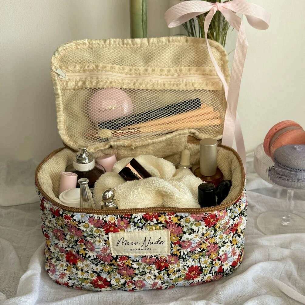 Perfekt til kvinder er denne Moon Nude rød/pink/hvid efterårsvaskepose, den er også lavet af 100% bomuld. Den måler 16 cm (højde) x 22 cm (bredde) x 14 cm (dybde). Det anbefales at vaske i hånden i koldt vand med et mildt rengøringsmiddel, eller maskinvask med vrangen ud på en skånsom cyklus. for at holde denne taske i god stand. Alle taskerne kommer komplet med moon nude emballage. Moon Nude Autumn Vanity Bag - Rød/Pink/Hvid er en absolut nødvendighed til rejser eller hverdagsbrug. Denne vasketøjstaske holder med garanti al din makeup eller hudpleje ét sted, samtidig med at den er stilfuld og moderigtig med sit håndlavede quiltede design.