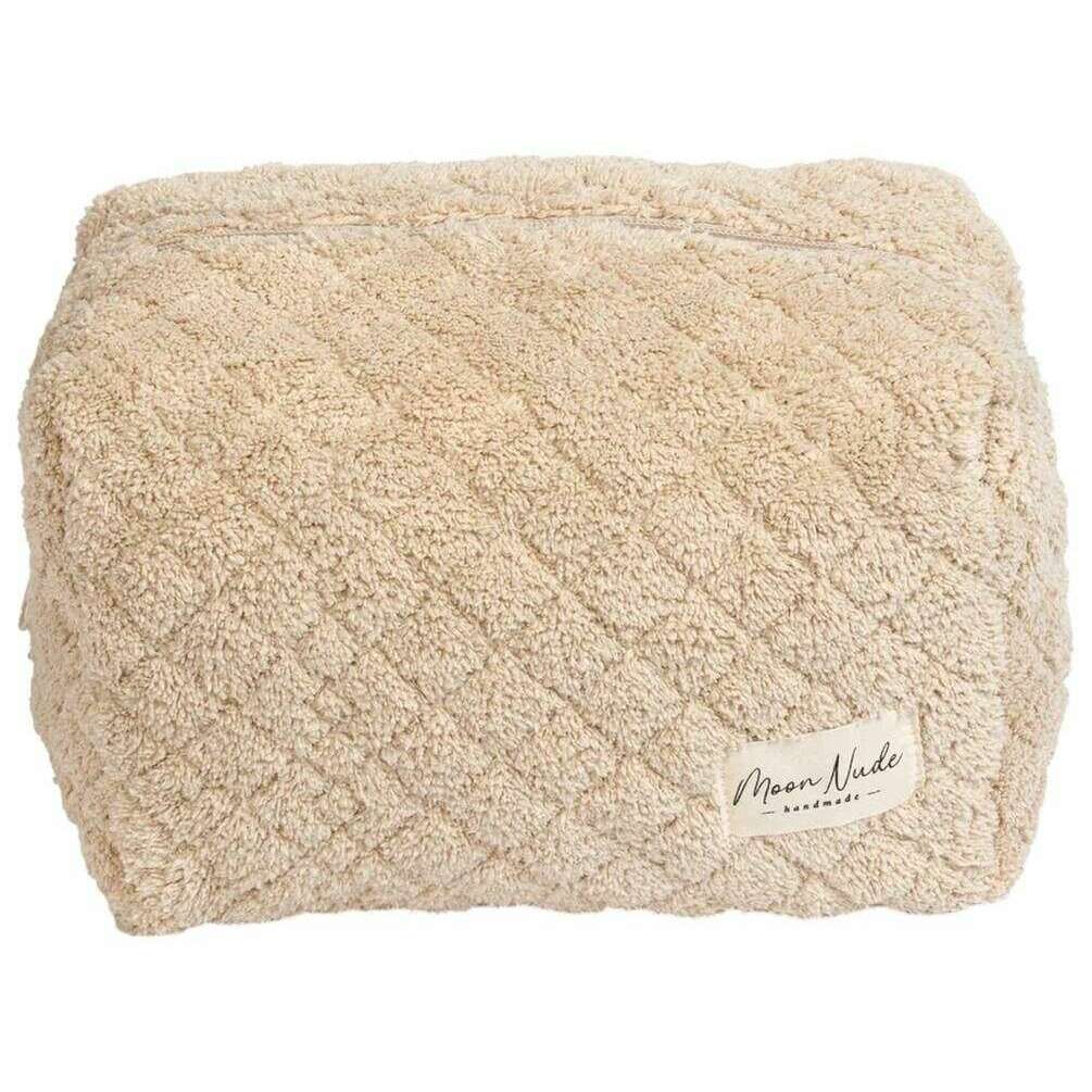 Denne store makeup-taske til kvinder er lavet af 100% bomuld, i en beige farve og er fra mærket Moon Nude. Den måler 15 cm (højde) x 25 cm (bredde) x 15 cm (dybde). Det anbefales at vaske i hånden i koldt vand med et mildt rengøringsmiddel, eller maskinvask med vrangen ud på en skånsom cyklus. for at holde denne taske i god stand. Alle taskerne kommer komplet med moon nude emballage. Moon Nude Teddy Large Makeup Bag - Beige er en absolut nødvendighed til dit værelse eller hverdagstaske. Denne makeuptaske vil med garanti holde alle dine mest brugte produkter sammen og sikre, samtidig med at den er stilfuld og smart med sit håndlavede quiltede design.