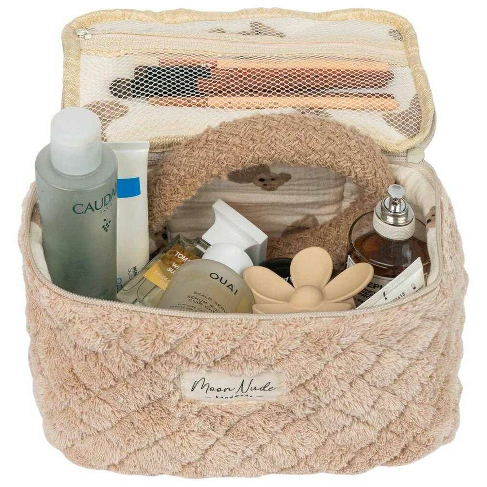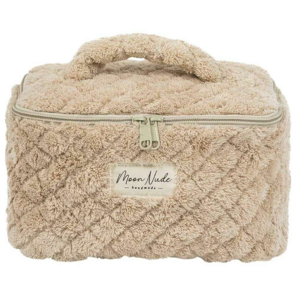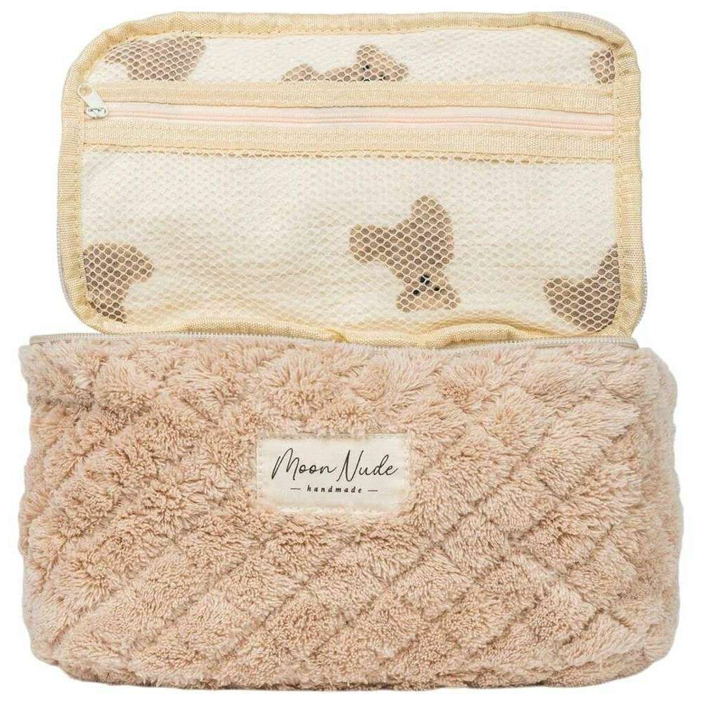 Denne vasketøjstaske til kvinder er designet af mærket Moon Nude i en beige farve og er lavet af 100% bomuld. Den måler 16 cm (højde) x 22 cm (bredde) x 14 cm (dybde). Det anbefales at vaske i hånden i koldt vand med et mildt rengøringsmiddel, eller maskinvask med vrangen ud på en skånsom cyklus. for at holde denne taske i god stand. Alle taskerne kommer komplet med moon nude emballage. Moon Nude Teddy Vanity Bag - Beige er en absolut nødvendighed til rejser eller hverdagsbrug. Denne vasketøjstaske holder med garanti al din makeup eller hudpleje ét sted, samtidig med at den er stilfuld og moderigtig med sit håndlavede quiltede design.