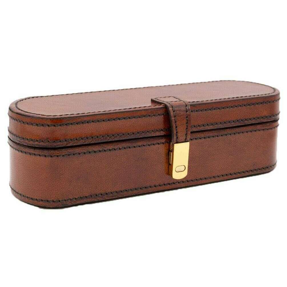 Dette læderrundede hjørne -smykkeboks til kvinder er udformet af mærket Orton West i en brun farve og er lavet af 100% læder. Det måler 6,5 cm (højde) x 21,5 cm (bredde) x 7 cm (dybde). Alle smykkebokse leveres komplet med Orton West Packaging. Orton West Leather Rounded Corner Jewellery Box - Brown er blevet udformet til et tidløst og smukt design, der er perfekt til at opbevare på nogens omklædningsbord eller hylder. De tre sektioner har en ring- og øreringsholder, mens de to andre er dybe store til opbevaring af dine halskæder eller armbånd. De afrundede kanter tilføjer et mere feminint touch, mens den mørke syning tilføjer dybde.