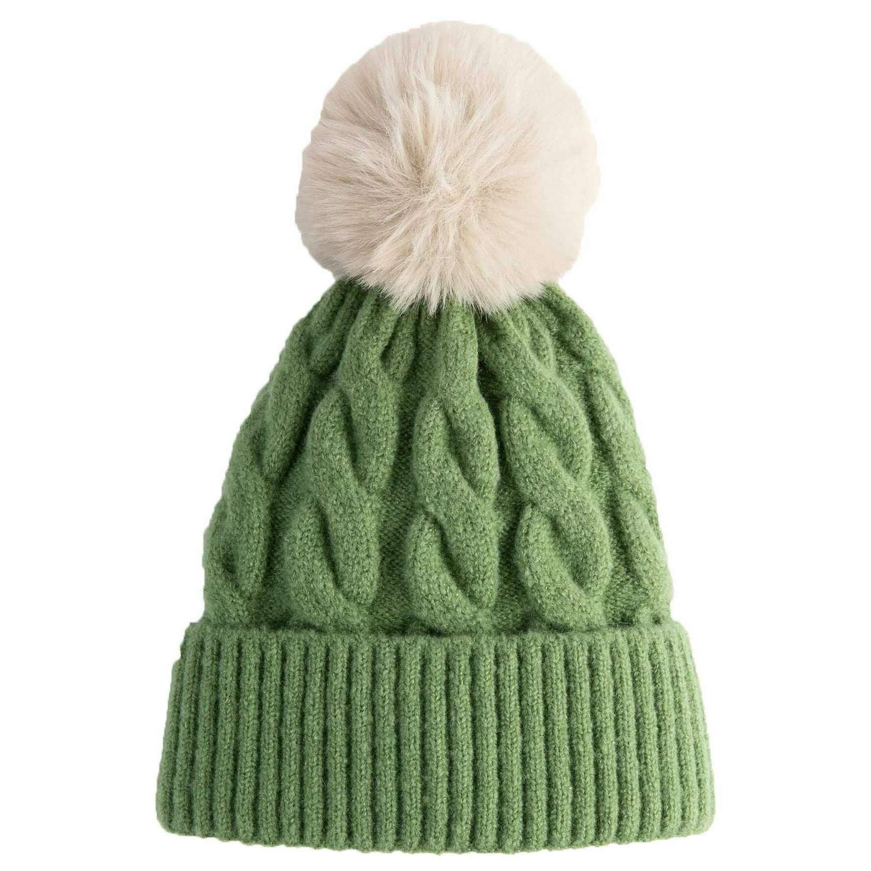 • Faux pels pom pom, chunky flettet stil strikket, ribbed drejeban