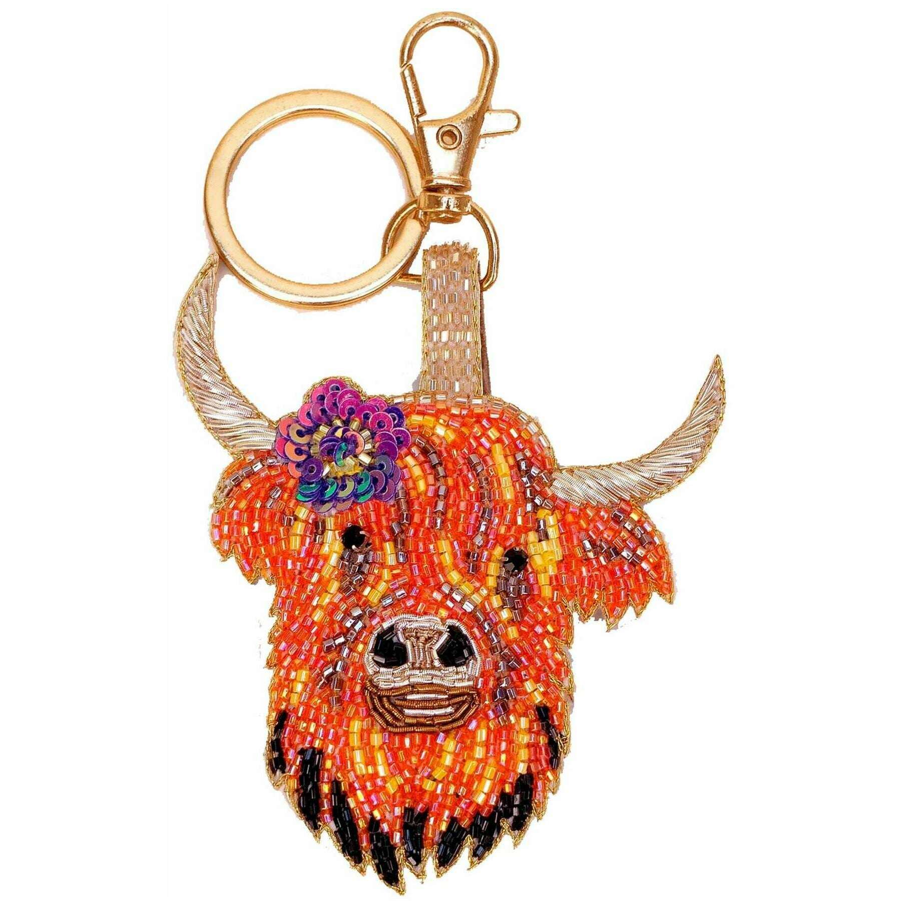 Powder Highland Cow Beaded Nøglering - Creme/Orange/Sort