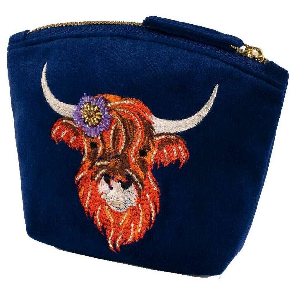 Powder Highland Cow Broderet Velvet Mini Pouch - Navy Blue/Orange/Beige