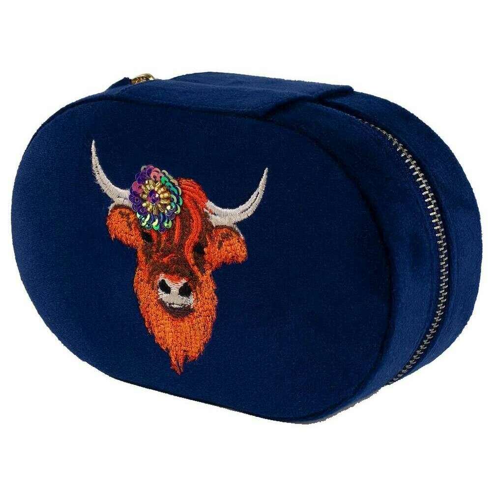 Powder Highland Cow Oval smykkeskrin - Marineblå/Orange/Beige