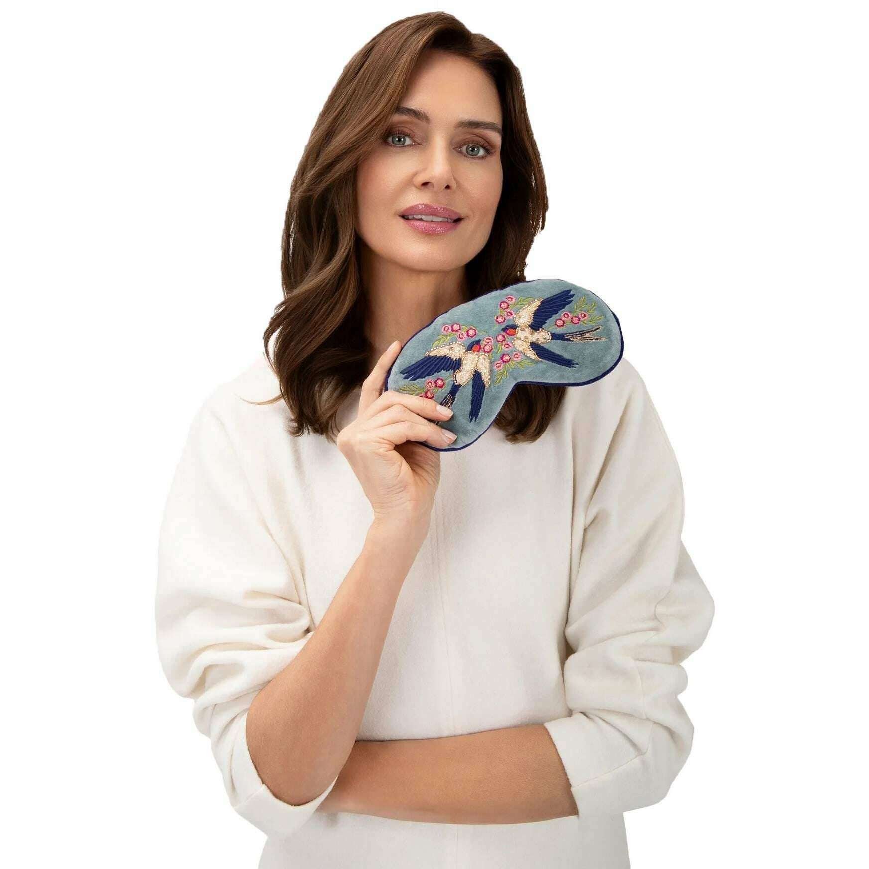 Denne kvindes svømende svaler Lavendel Eye Mask af brandpulveret er lavet af 100% polyester fløjl og vises i blåt. Det måler 9,5 cm (højde) x 20 cm (bredde). Alle øjenmasker leveres komplet med pulvermærker. Pulveret svalende svaler Lavendel Eye Mask - Ice Blue gør søvn så meget mere luksuriøs. Den forbløffende bløde fløjlsfinish føles afslappende og behagelig, og det elastiske bånd vil sikre det perfekt til dit hoved for et fredeligt slid, mens lavendelaromaen fra de indre lavendelfrø sender dig i søvn. Mønsteret er dygtigt broderet med en fantastisk detalje, hvilket gør det til et tilbehør, som du vil vise frem.