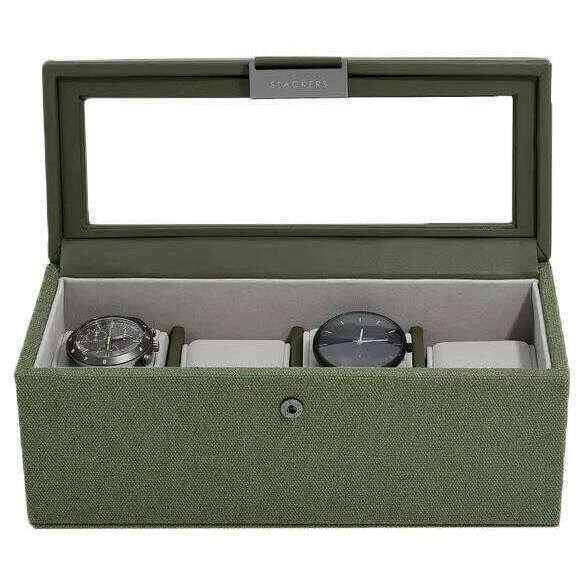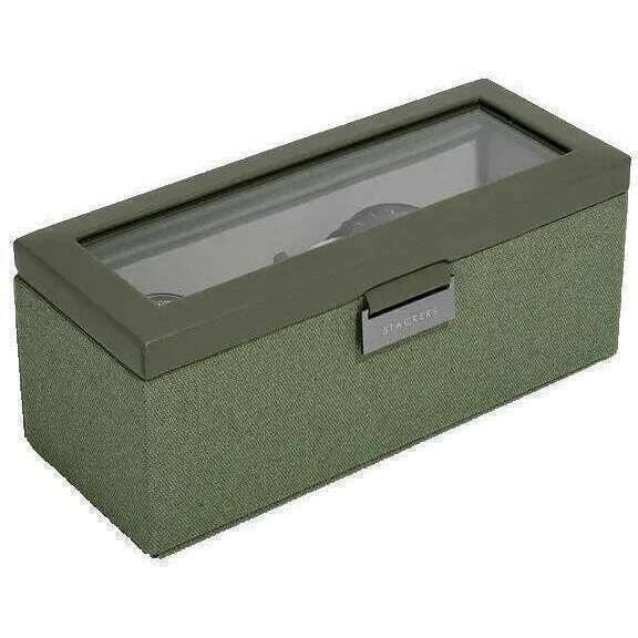 Dette herres lærred 4 -stykke urboks af Brand Stackers er lavet af faux læder og lærred og vises i grønt. Det måler 24 cm (højde) x 9,5 cm (bredde) x 9,8 cm (dybde). Alle Gentlemen's Boxes kommer komplet i stablers emballage. Stackers Canvas 4 -stykket urboks - Green er ideel til at holde alle dine ure et sted og udstillet inde i en smart boks, der forhindrer dem i at opsamle støv i en skuffe, når de ikke bæres. Hvert af dine ure kan blive spændt rundt om en lille pude til attraktiv præsentation. Et must for enhver gentleman's samling.