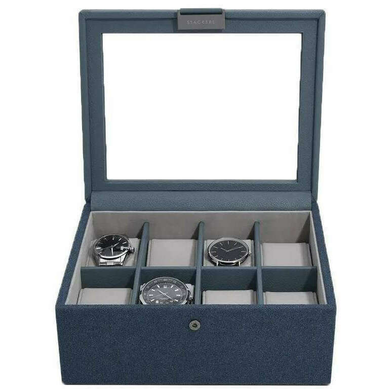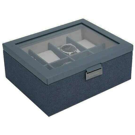 Bragt til dig af Brand Stackers er denne blå mænds lærred 8 stykke urboks lavet af faux læder og lærred. Det måler 26 cm (højde) x 19 cm (bredde) x 9,8 cm (dybde). Alle Gentlemen's Boxes kommer komplet i stablers emballage. Stackers lærred 8 stykke urboks - blå er ideel til at holde alle dine ure et sted og udstillet inde i en smart kasse, der forhindrer dem i at opsamle støv i en skuffe, når de ikke bæres. Hvert af dine ure kan blive spændt rundt om en lille pude til attraktiv præsentation. Et must for enhver gentleman's samling.