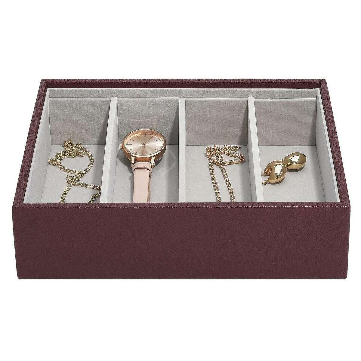 Dette klassiske tilbehørslag til briller til kvinder fra mærket Stackers er lavet af imiteret læder og fløjl og fremvises i bordeaux. Den måler 6 cm (højde) x 25 cm (bredde) x 18 cm (dybde). Alle smykkeæskerne leveres komplet med stabler-emballage. Stackers Classic Glasses Accessory Layer - Burgundy har fire større sektioner til alle dine større smykker. Dette smukke bordeaux-smykkelag er perfekt til opbevaring af større genstande som solbriller, ure og armringe.