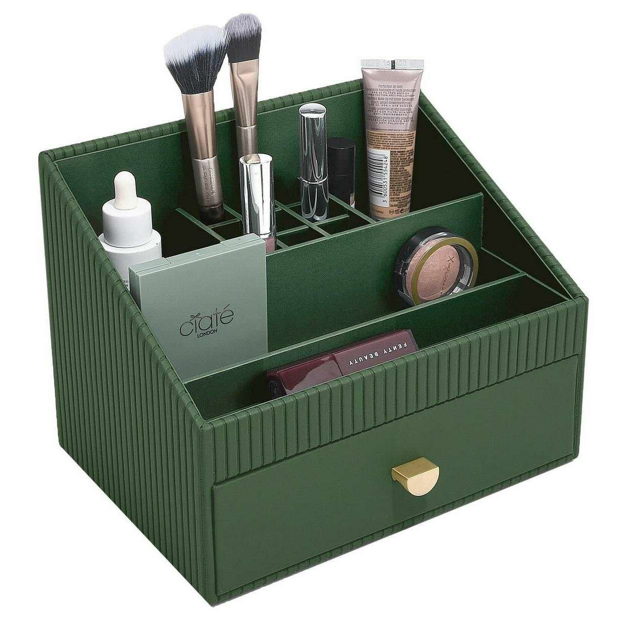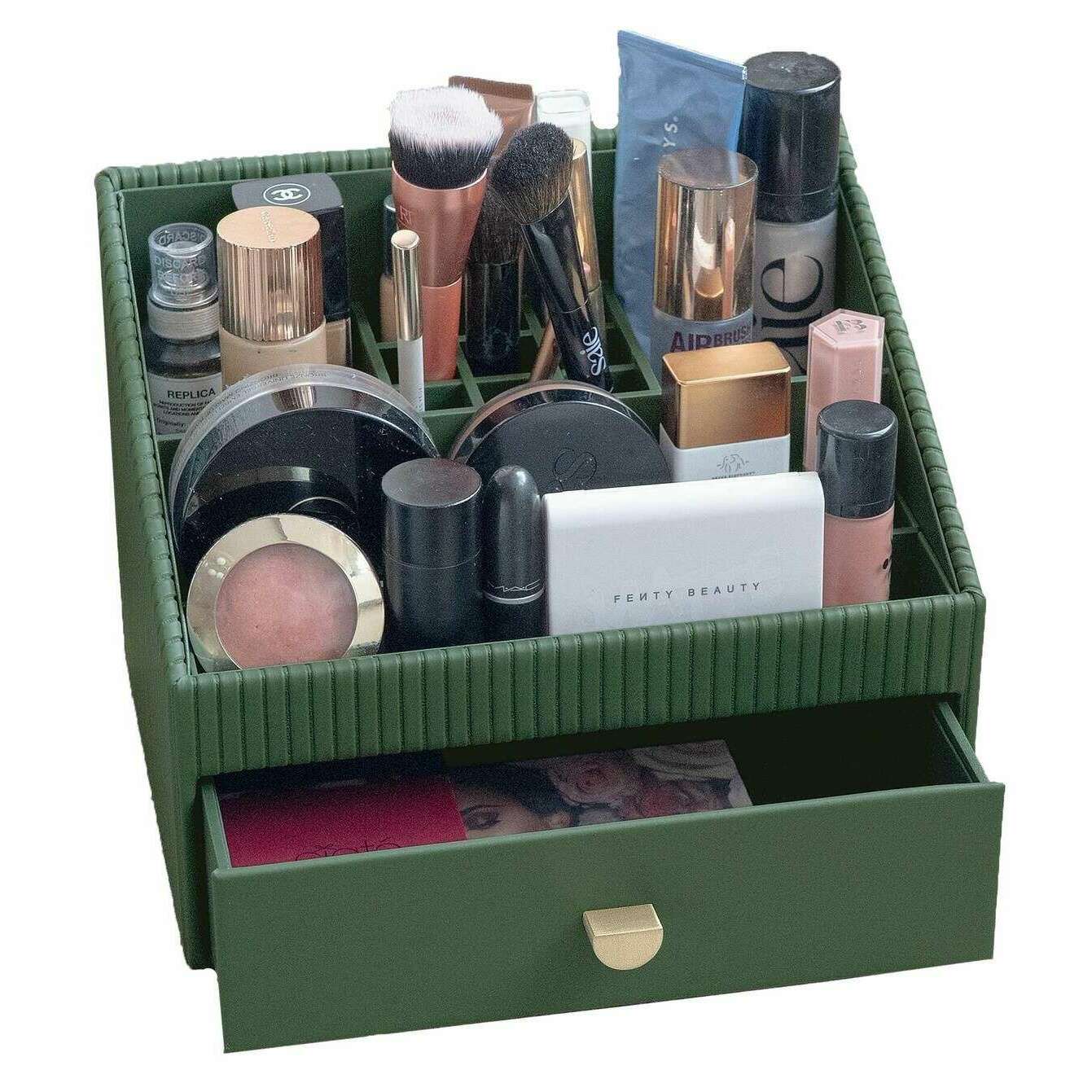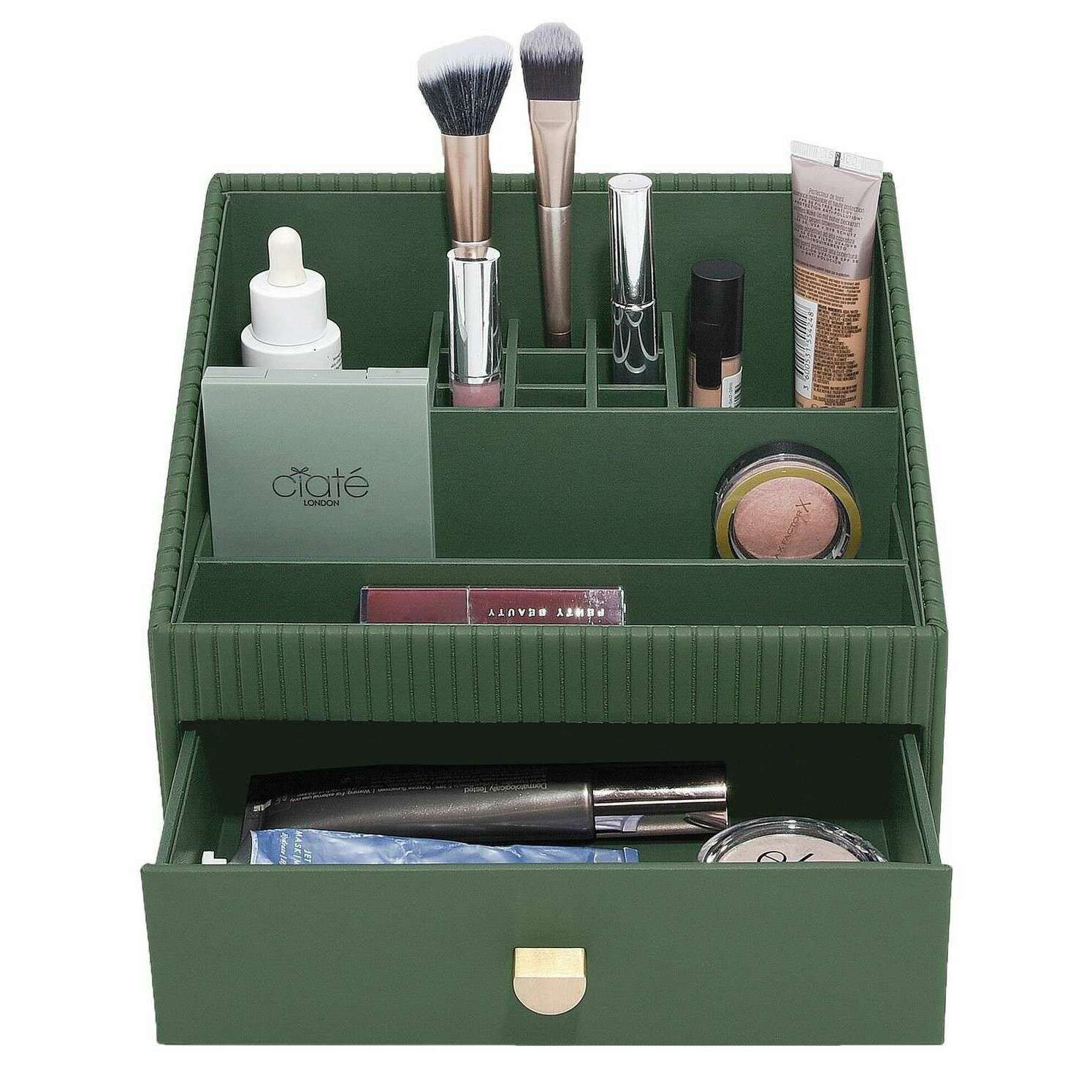 Denne klassiske makeup-arrangør til kvinder af mærket Stackers er lavet af imiteret læder og pvc og fremvises i grønt. Den måler 19 cm (højde) x 25 cm (bredde) x 18 cm (dybde). Alle makeup-arrangørerne leveres komplet med stabler-emballage. Stackers Classic Makeup Organizer - Emerald Green har flere rum til din makeup eller hudplejeprodukter. Denne smukke ribbede grønne makeup-arrangør har træk til større produkter, perfekt til at holde orden og spare plads!