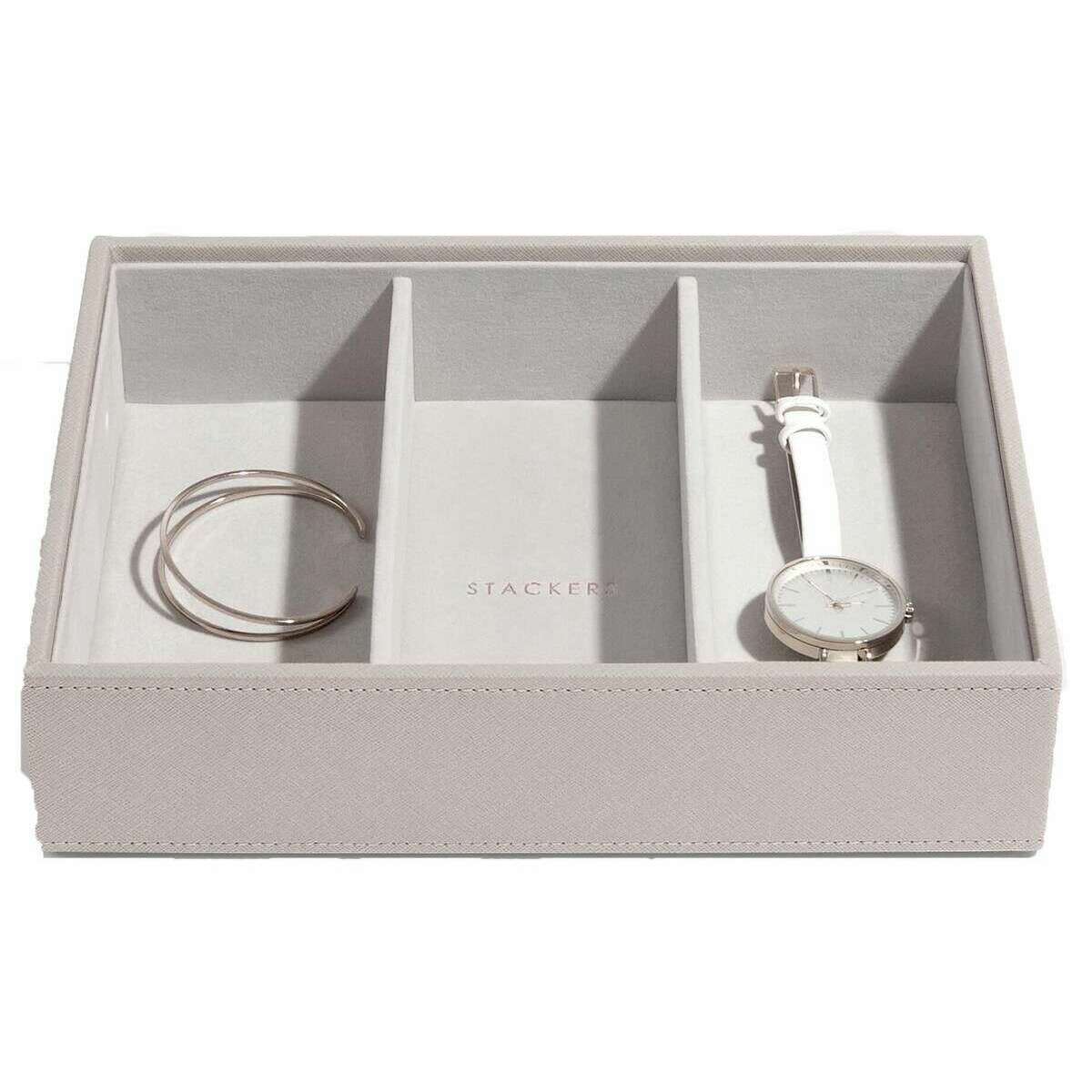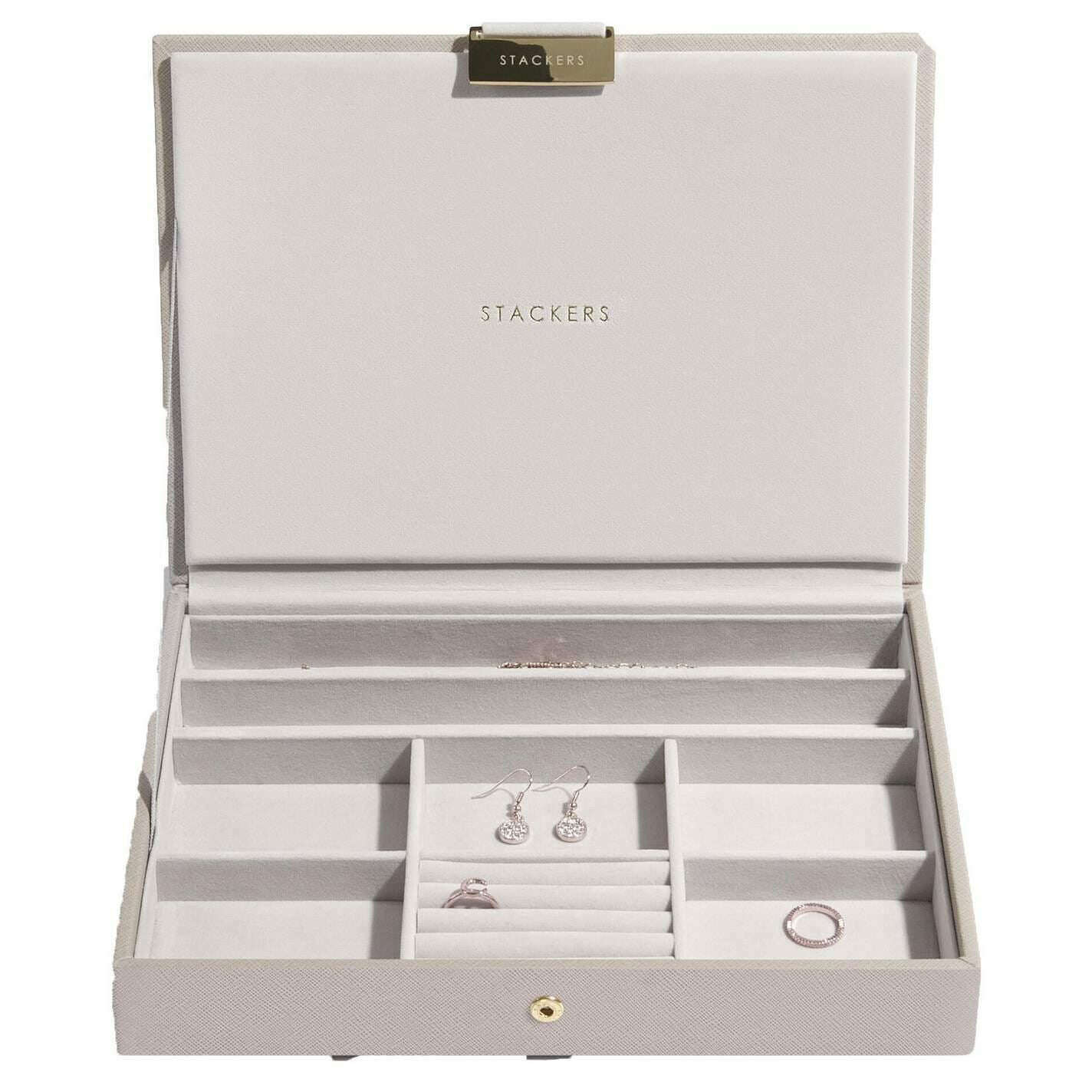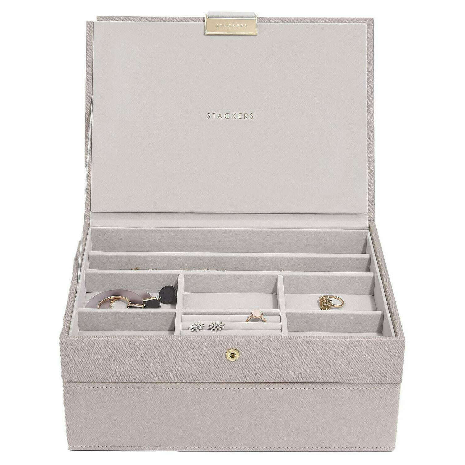 Vi introducerer dette klassiske sæt med 2 smykkeskrin til kvinder fra Stackers, det er fremstillet af imiteret læder og fløjl i en taupe farve. Den måler 11 cm (højde) x 25 cm (bredde) x 18 cm (dybde). Alle smykkeæskerne leveres komplet med stabler-emballage. Stackers klassiske sæt med 2 smykkeskrin - Taupe har et klassisk taupe smykkeskrindesign. Dette smykkeskrin er perfekt til opbevaring af alle dine smykker! Leveres komplet med to lag og sektioner i flere størrelser til øreringe og armbånd og en større sektion til ure og armringe.