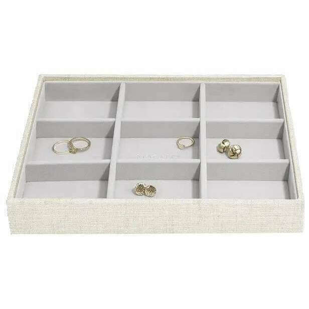 Denne kvindeklassiske erklæringsbakke er lavet af faux læder og linned, der er vist i en beige farve og er fra brandstablerne. Det måler 3,7 cm (højde) x 25 cm (bredde) x 18 cm (dybde). Alle smykkekasser kommer komplet i stablere emballage. Stackers klassiske udsagnsbakke - havregryn/linned beige er blevet klogt oprettet og designet til at holde alle dine øreringe perfekt. Det kan føjes til enhver anden klassisk smykkebakke for at oprette en smykkekasse, eller den kan bruges på egen hånd. Du behøver ikke at gå på kompromis med organisationen.