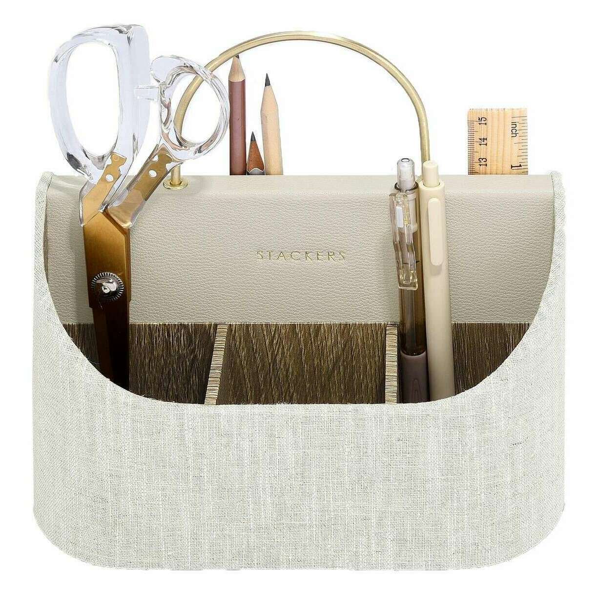 Denne skrivebordscaddie til kvinder er designet af mærket Stackers i en beige farve og er lavet af imiteret læder. Den måler 21 cm (højde) x 21 cm (bredde) x 13 cm (dybde). Alt skrivebordstilbehør leveres komplet med stableremballage. Stackers Desk Caddy - Oatmeal Beige/Lin Beige er et must have til ethvert skrivebord! Denne beige skrivebordsholder er perfekt til opbevaring af stationært udstyr og har endda et håndtag, der gør den let at transportere.