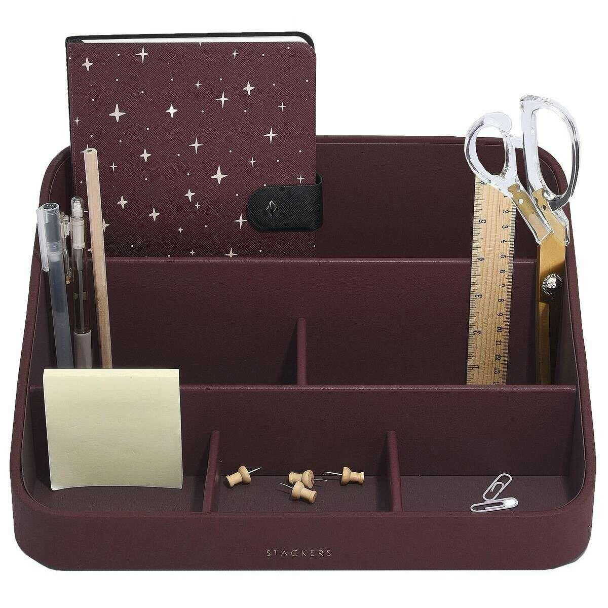 Fremstillet af imiteret læder er denne bordeaux granat til kvinders skrivebordsarrangement af designeren Stackers. Den måler 14,5 cm (højde) x 24,5 cm (bredde) x 32,5 cm (dybde). Alt skrivebordstilbehør leveres komplet med stableremballage. Stackers Desk Organizer - Granat Burgundy har et smukt bordeaux-design. Denne skrivebordsarrangør har mange sektioner til stationært udstyr, notesbøger og mange flere nipsgenstande, alt inden for rækkevidde!