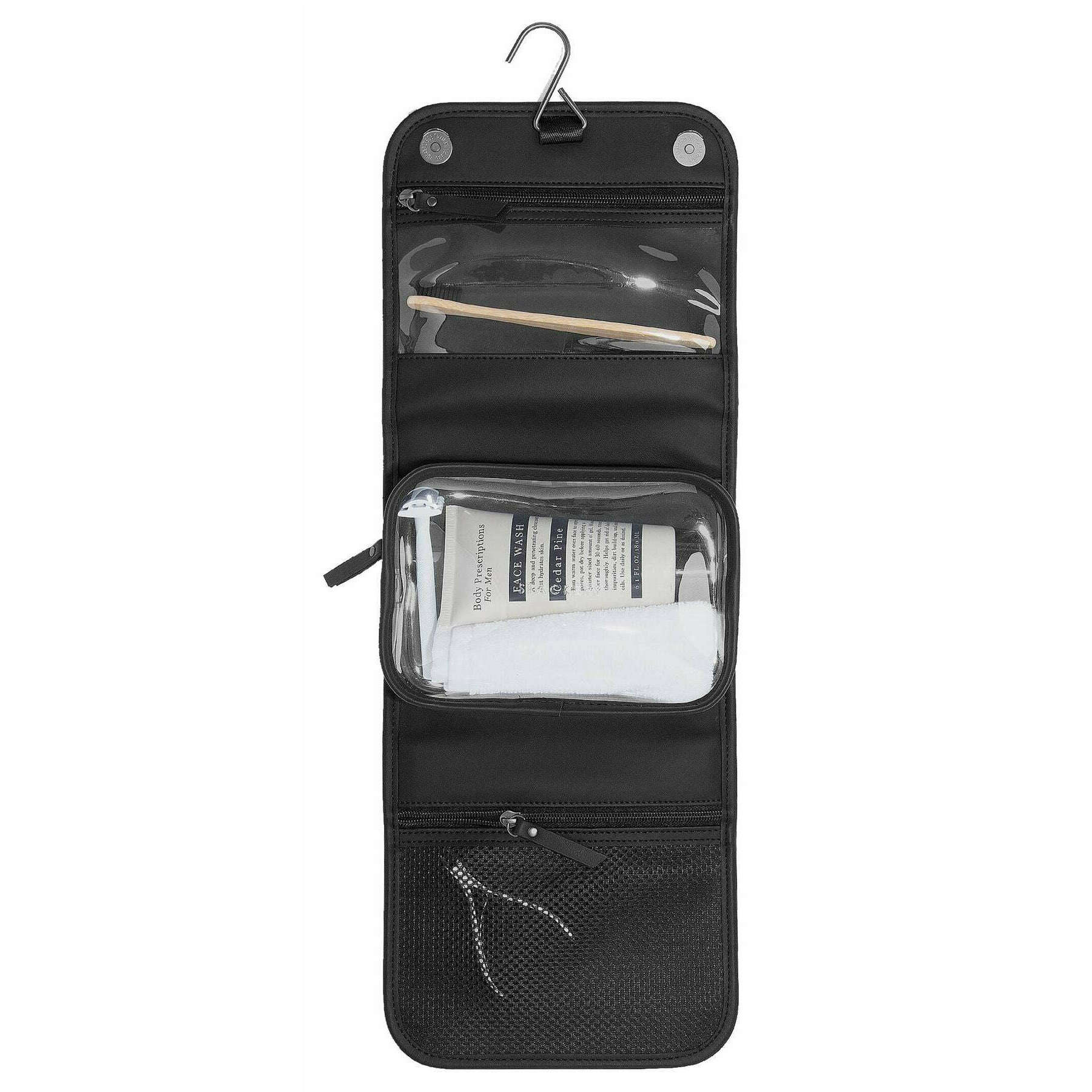 • 2 indvendige lynlåsrum, aftagelig klar toilettaske, hængekrog