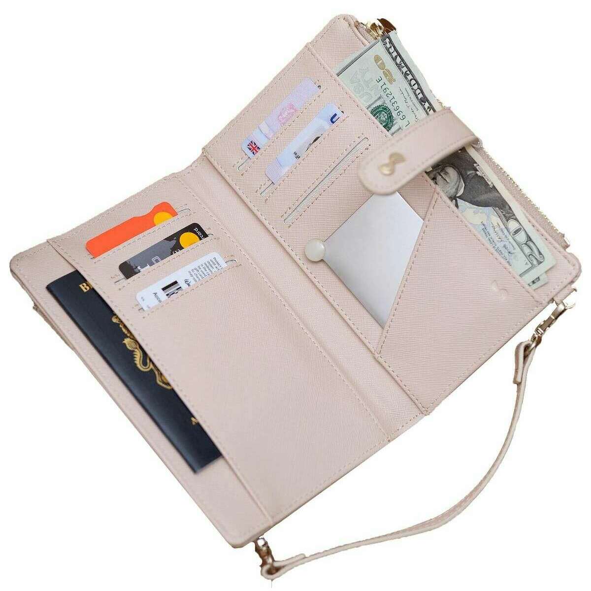 • Ekstern telefonlomme, 6 kortpladser, kosmetisk spejl, aftagelig møntlomme med lynlås, aftagelig håndledsstrop, trykknapper