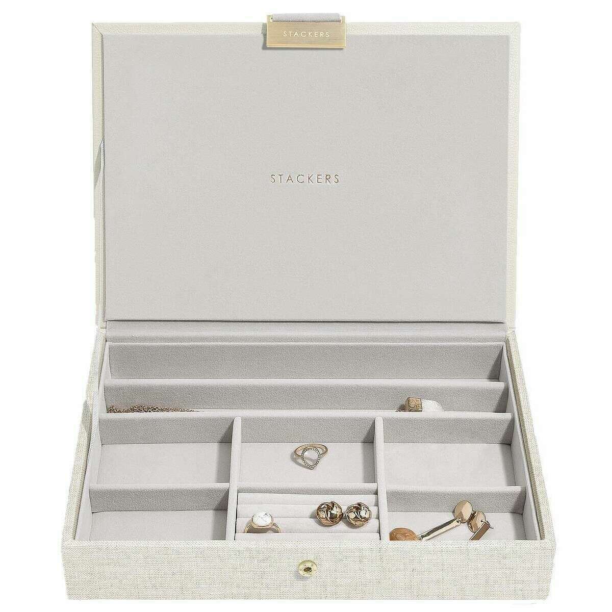 Designer Stackers har bragt dig denne kvindes faux læder og linned smykkeskasse ved hjælp af havregryn/linned beige toner. Det måler 18,2 cm (højde) x 25 cm (bredde) x 18 cm (dybde). Alle smykkekasser kommer komplet i stablere emballage. Stablernes sæt med 4 klassiske smykkeboks - havregryn/linned beige vil være sikker på at imponere med sin utrolige mængde plads. Med et øverste lågssektion til de dyrebare små stykker, en midterste 25 sektionsbakke til disse charme eller ringe, en anden midterste bakke med tre sektioner til at holde dine armbånd og halskæder med ringruller for at opbevare flere ringe og øreringe, og så er bunden en dyb tre sektionsboks for de større ting som store armbånd, ure og solglas. Gør dette til den mest ideelle smykkeboks, du kan eje med den, der tilbyder så meget på den mest luksuriøse måde.