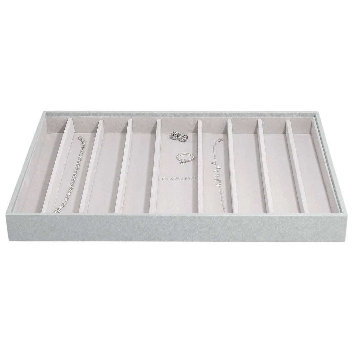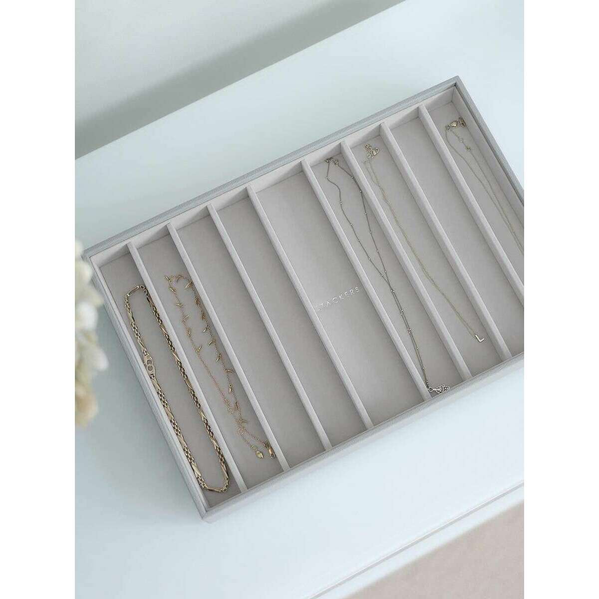 Fremstillet af imiteret læder og fløjl er dette småstensgrå halskædelag for kvinder i superstørrelse af designeren Stackers. Den måler 4 cm (højde) x 36 cm (bredde) x 23,9 cm (dybde). Det anbefales at tørre af for at holde dette smykkeskrin i god stand. Alle smykkeæskerne leveres komplet med stabler-emballage. Stackers Supersize Halskæde Layer - Pebble Grey er designet til at holde dine halskæder organiserede og fri for sammenfiltring. Med et blødt fløjlsinteriør vil dette helt sikkert imponere dem, der har masser af smykker at organisere og beskytte mod at blive beskadiget. Dette er perfekt at have på din kommode eller kommode på grund af dets enkle design, der gør det passer til ethvert rum, eller det kan kombineres med andre supersize lag for at skabe dit perfekte smykkeskrin.