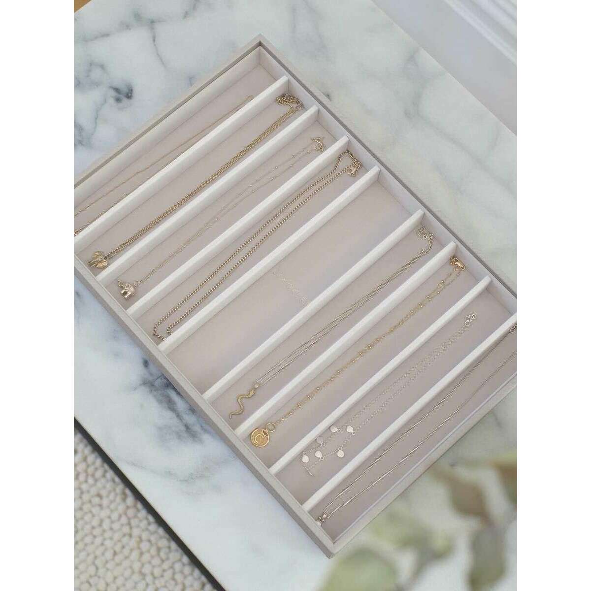 Dette vellavede halskædelag til kvinder i superstørrelse fra Stackers kommer i en taupe beige farve og er fremstillet af imiteret læder og fløjl. Den måler 4 cm (højde) x 36 cm (bredde) x 23,9 cm (dybde). Det anbefales at tørre af for at holde dette smykkeskrin i god stand. Alle smykkeæskerne leveres komplet med stabler-emballage. Stackers Supersize Halskæde Layer - Taupe Beige er designet til at holde dine halskæder organiserede og fri for sammenfiltring. Med et blødt fløjlsinteriør vil dette helt sikkert imponere dem, der har masser af smykker at organisere og beskytte mod at blive beskadiget. Dette er perfekt at have på din kommode eller kommode på grund af dets enkle design, der gør det passer til ethvert rum, eller det kan kombineres med andre supersize lag for at skabe dit perfekte smykkeskrin.
