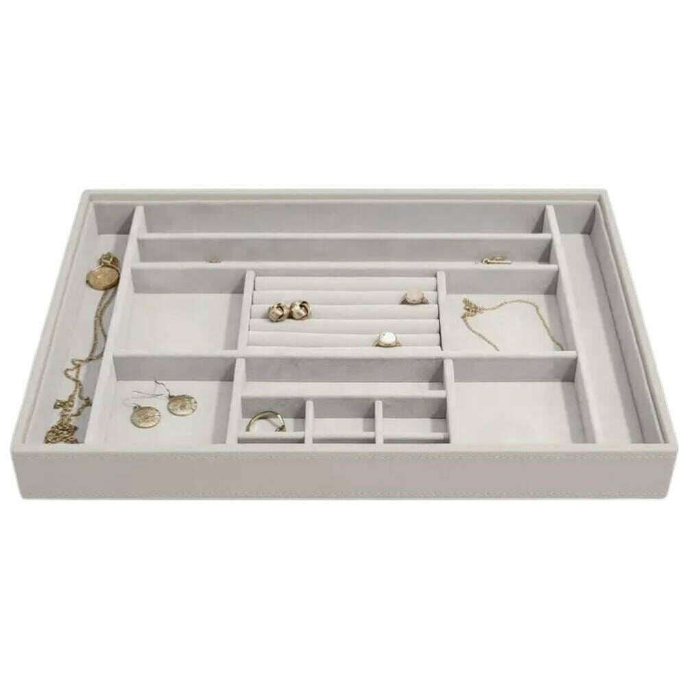 Dette tilbehørslag til damering i superstørrelse af mærket Stackers er lavet af imiteret læder og fløjl og fremvises i beige. Den måler 4 cm (højde) x 36 cm (bredde) x 23,9 cm (dybde). Det anbefales at tørre af for at holde dette smykkeskrin i god stand. Alle smykkeæskerne leveres komplet med stabler-emballage. Stackers Supersize Ring Accessory Layer - Taupe Beige giver dig mulighed for at stable dette med andre supersize-lag fra stabler-kollektionen for at skabe dit eget tilpassede smykkeskrin, der passer til dine behov. Alternativt kan den bruges alene til at organisere dine ringe, armbånd og andet lille tilbehør. Ekspert udformet med materialer af høj kvalitet, dette dejlige lag ville være perfekt til dem, der elsker at udstyre.