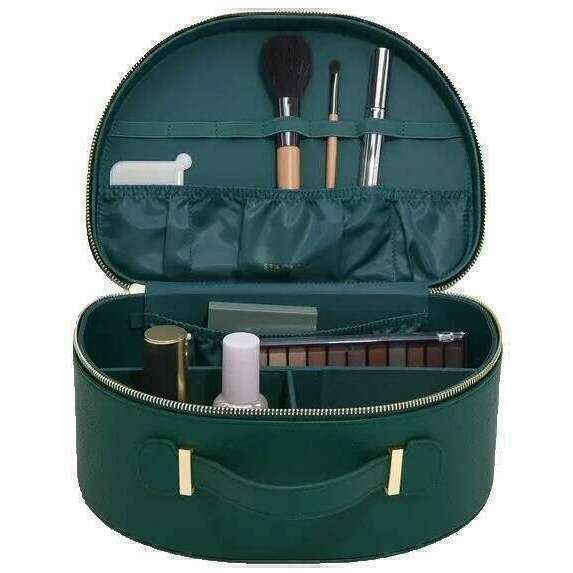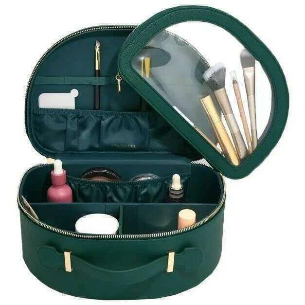 • Håndtag, lynlås lukning, elastiske løkker, elastisk pose på indvendigt låg, aftagelig klar pose, interne skillelinjer, inkluderet spejl